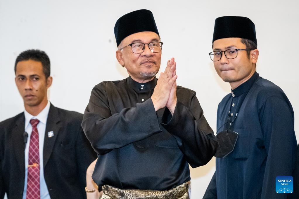 Malaysia's newly appointed Prime Minister Anwar Ibrahim leaves after a press conference following his swearing-in ceremony in Selangor, Malaysia, Nov. 24, 2022. (Xinhua/Zhu Wei)