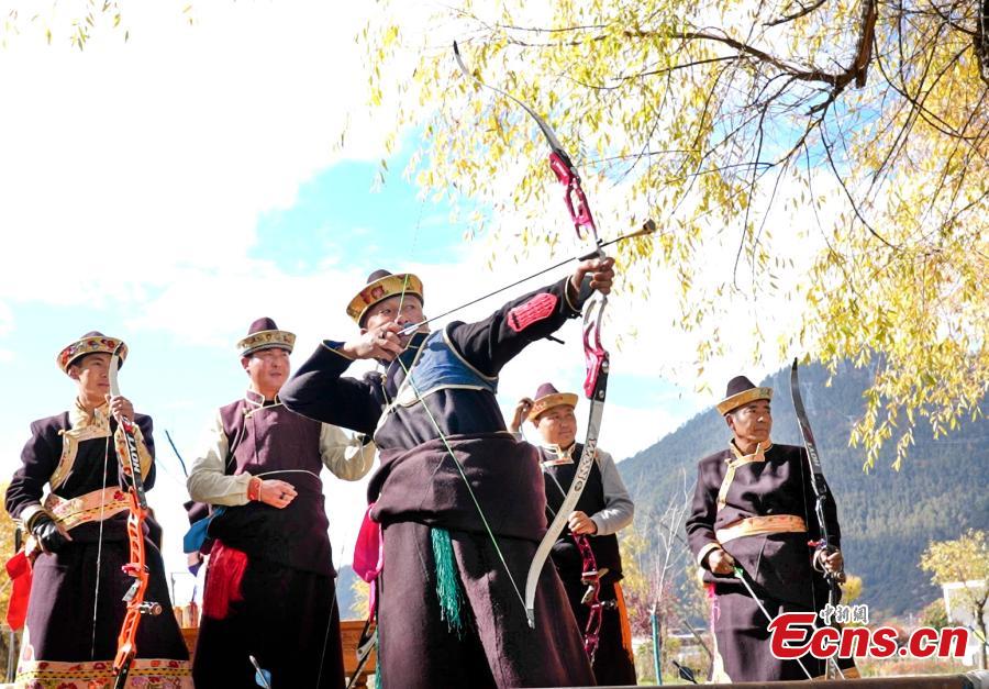 Locals take part in the traditional "Gongbo archery" competition to celebrate the Gongbo New Year by the Tibetan calendar, which falls on Nov. 24 this year, in Nyingchi city, southwest China’s Tibet Autonomous Region, Nov. 24, 2022. (Photo/China News Service)