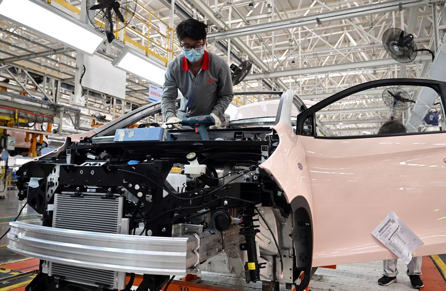 Workers are busy on the production line of new energy vehicles (NEVs) at a factory of Chinese automaker Chery Holding Group Co., Ltd. in Wuhu City, east China's Anhui Province, Oct. 12, 2022. (Xinhua/Zhou Mu)
