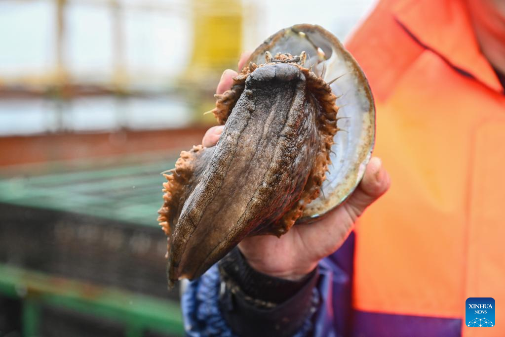 This photo taken on Nov. 25, 2022 shows an abalone on a transport vessel in Lianjiang County of southeast China's Fujian Province. (Xinhua/Zhou Yi)