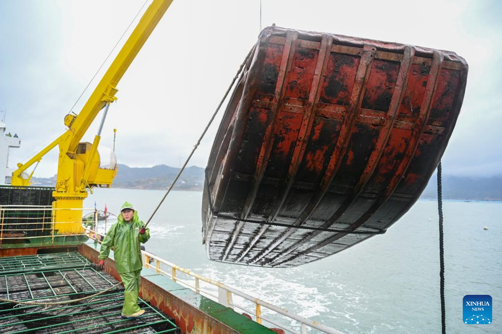 Fishermen transfer abalones from transport vessels to a breeding base in Lianjiang County of southeast China's Fujian Province, Nov. 25, 2022. (Xinhua/Zhou Yi)