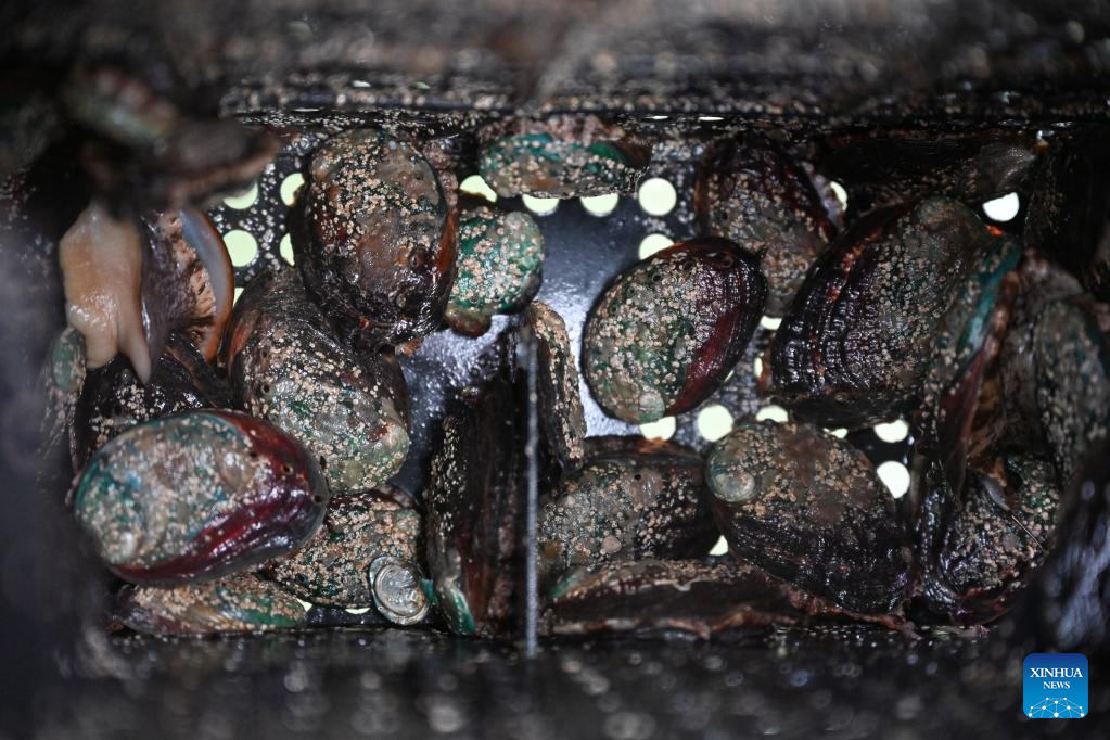 This photo taken on Nov. 25, 2022 shows abalones on a transport vessel in Lianjiang County of southeast China's Fujian Province. (Xinhua/Zhou Yi)