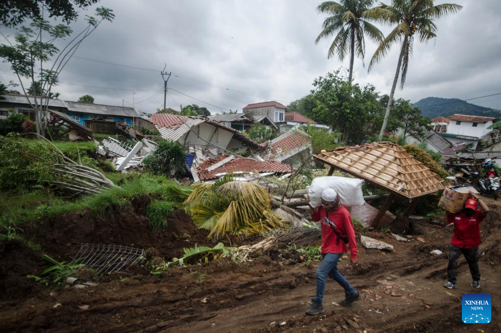Volunteers deliver aid for villagers after a 5.6-magnitude earthquake in Cianjur, West Java, Indonesia, Nov. 27, 2022. (Photo by Septianjar Muharam/Xinhua)