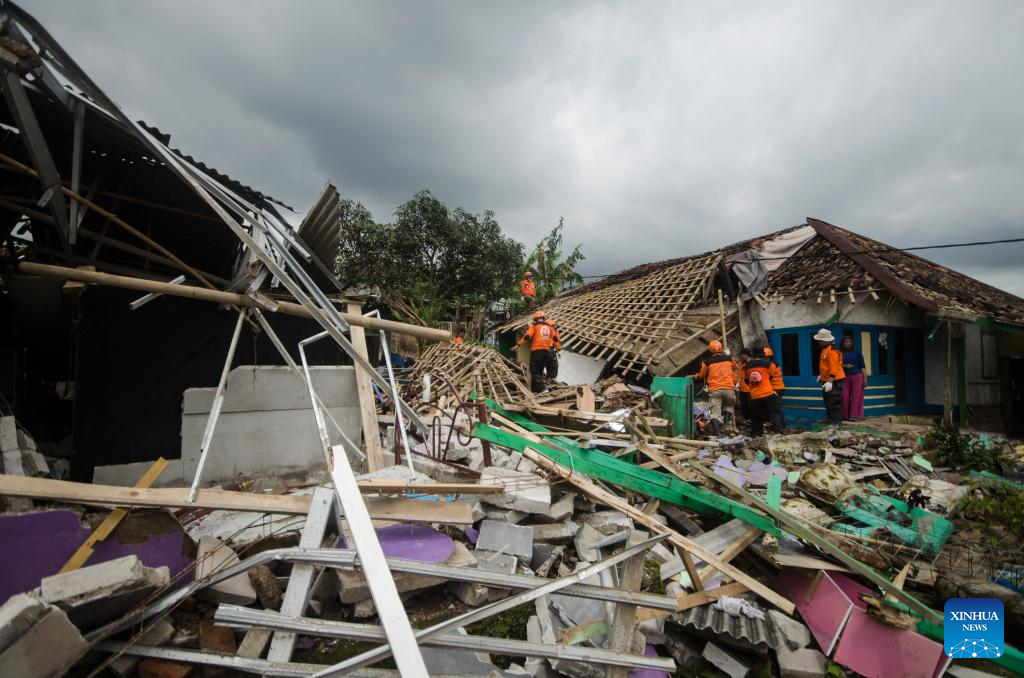 Rescuers work on the ruins after a 5.6-magnitude earthquake in Sukamulya village of Cianjur, West Java, Indonesia, Nov. 27, 2022. (Photo by Septianjar Muharam/Xinhua)