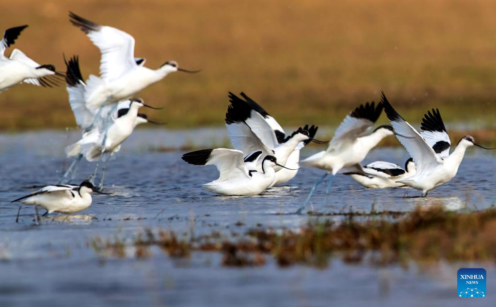 A flock of pied avocets are seen in the Matou section of the Yihe River in Tancheng County, Linyi City, east China's Shandong Province, Nov. 27, 2022. (Photo by Fang Dehua/Xinhua)