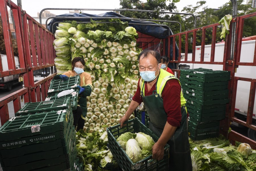 Workers carry vegetables at a logistics company in southwest China's Chongqing, Nov. 12, 2022. (Xinhua/Wang Quanchao)