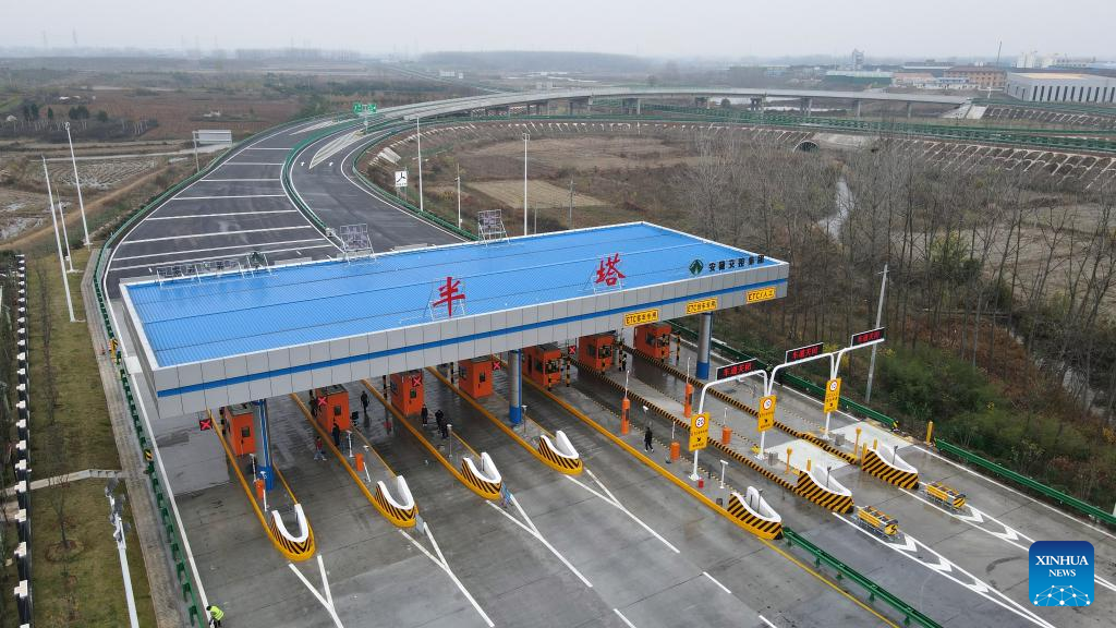 This aerial photo taken on Nov. 27, 2022 shows Banta toll station of an expressway linking Lai'an County and Tianchang City of Chuzhou, east China's Anhui Province. The 67.135-kilometer-long expressway has passed acceptance check. (Xinhua/Liu Junxi)