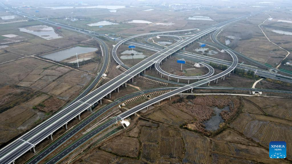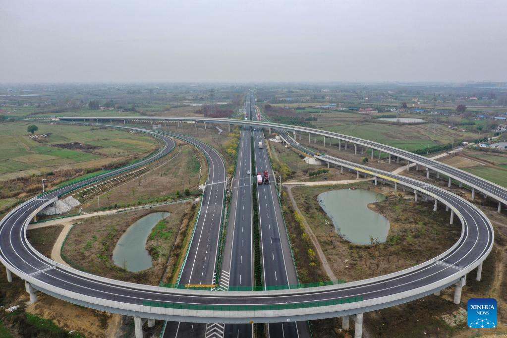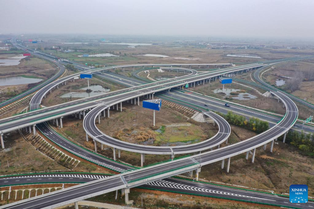 This aerial photo taken on Nov. 27, 2022 shows Zhengji interchange of an expressway linking Lai'an County and Tianchang City of Chuzhou, east China's Anhui Province. The 67.135-kilometer-long expressway has passed acceptance check. (Photo by Liu Yucai/Xinhua)