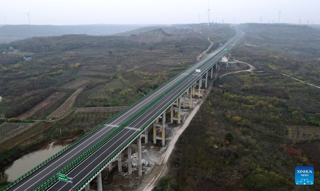 This aerial photo taken on Nov. 27, 2022 shows Fushan interchange of an expressway linking Lai'an County and Tianchang City of Chuzhou, east China's Anhui Province. The 67.135-kilometer-long expressway has passed acceptance check. (Xinhua/Liu Junxi)