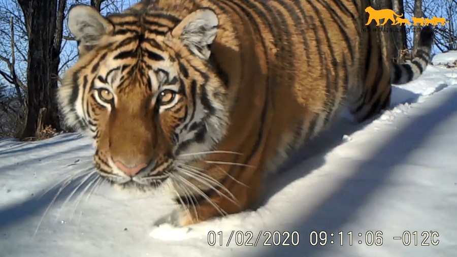 Photo taken with a monitoring camera shows a wild Siberian tiger in the Northeast China Tiger and Leopard National Park in northeast China, Jan. 2, 2020. (Xinhua)