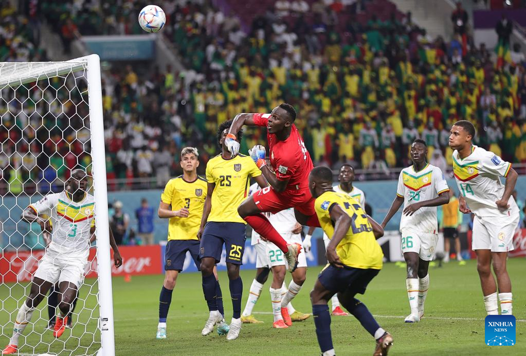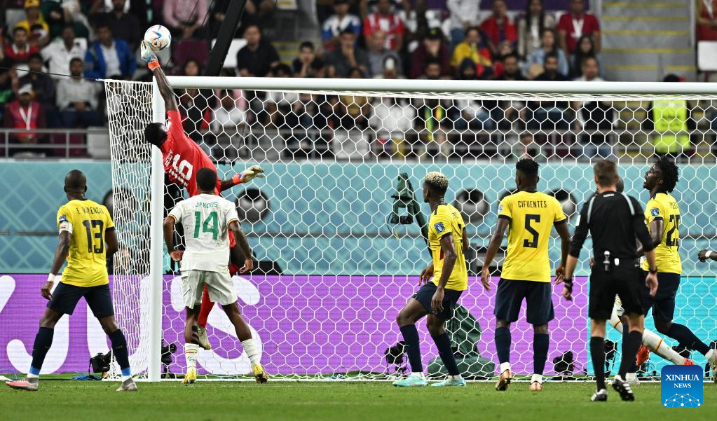 Edouard Mendy (Top), goalkeeper of Senegal, makes a save the Group A match between Ecuador and Senegal at the 2022 FIFA World Cup at Khalifa International Stadium in Doha, Qatar, Nov. 29, 2022. (Xinhua/Wang Dongzhen)