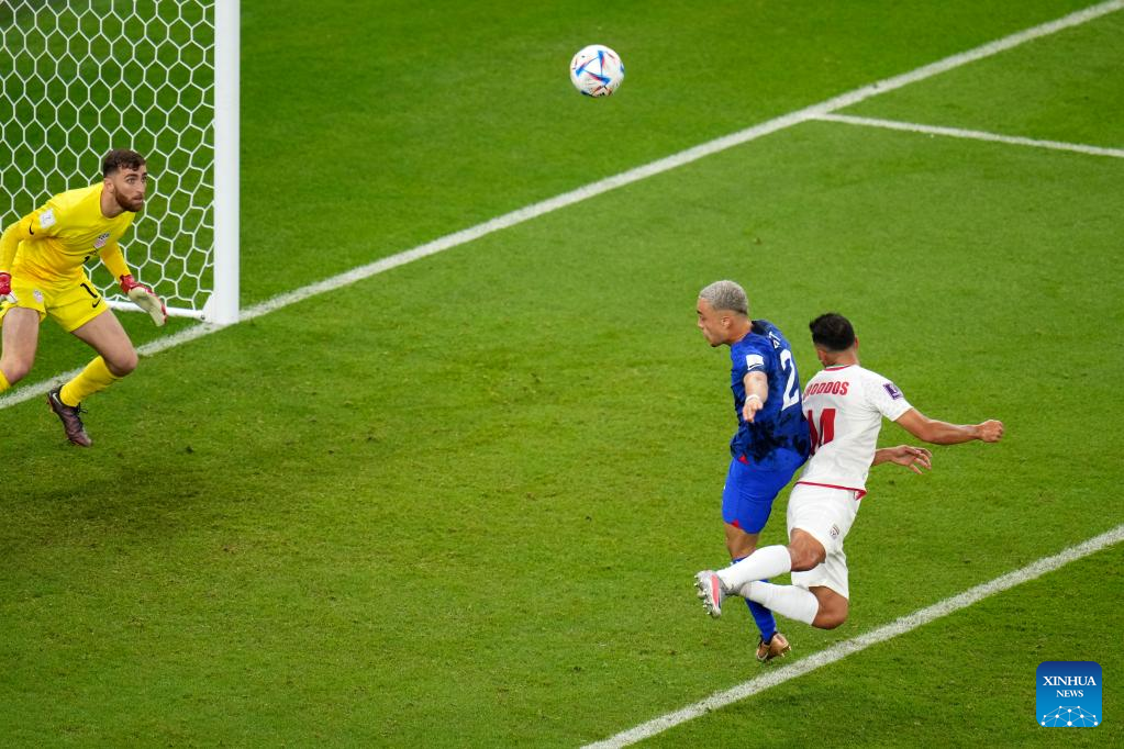 Saman Ghoddos (R) of Iran heads for the ball to shoot during the Group B match between Iran and the United States at the 2022 FIFA World Cup at Al Thumama Stadium in Doha, Qatar, Nov. 29, 2022. (Xinhua/Meng Dingbo)