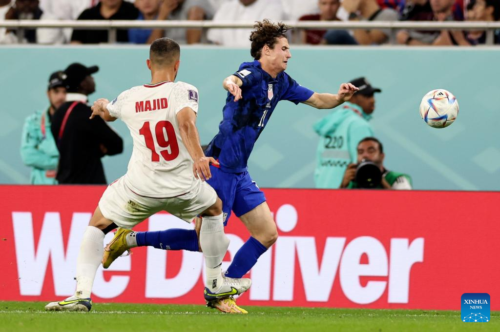 Brenden Aaronson (R) of the United States is tackled by Majid Hosseini of Iran during the Group B match between Iran and the United States at the 2022 FIFA World Cup at Al Thumama Stadium in Doha, Qatar, Nov. 29, 2022. (Xinhua/Xu Zijian)
