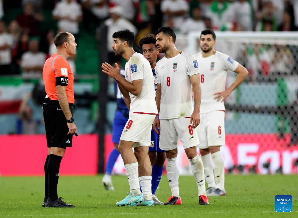 Mehdi Taremi (3rd R) of Iran communicates with referee Antonio Mateu Lahoz during the Group B match between Iran and the United States at the 2022 FIFA World Cup at Al Thumama Stadium in Doha, Qatar, Nov. 29, 2022. (Xinhua/Xu Zijian)