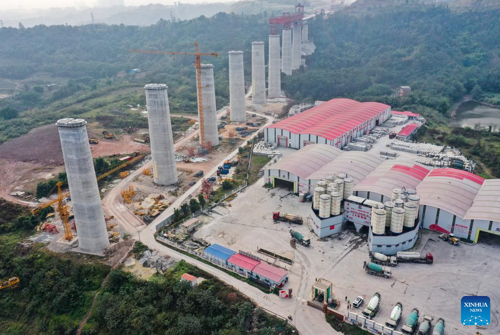 This aerial photo taken on Nov. 28, 2022 shows a concrete batching plant and the Huafu mega bridge under construction at the Sichuan-Chongqing section of the Chongqing-Kunming high-speed railway in southwest China's Chongqing Municipality. The 699-kilometer-long Chongqing-Kunming high-speed railway with a designed speed of 350 kilometers per hour is a key constituent of the railway corridor linking China's capital Beijing and Kunming in southwest China's Yunnan Province. (Xinhua/Wang Quanchao)