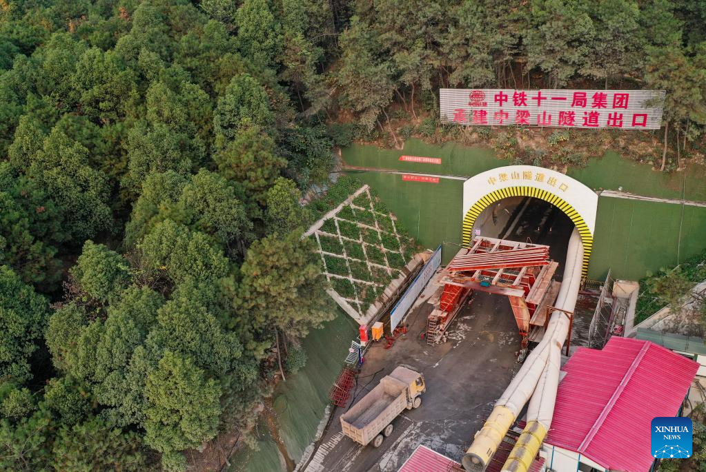 This aerial photo taken on Nov. 28, 2022 shows Zhongliangshan tunnel under construction at the Sichuan-Chongqing section of the Chongqing-Kunming high-speed railway in southwest China's Chongqing Municipality. The 699-kilometer-long Chongqing-Kunming high-speed railway with a designed speed of 350 kilometers per hour is a key constituent of the railway corridor linking China's capital Beijing and Kunming in southwest China's Yunnan Province. (Xinhua/Wang Quanchao)