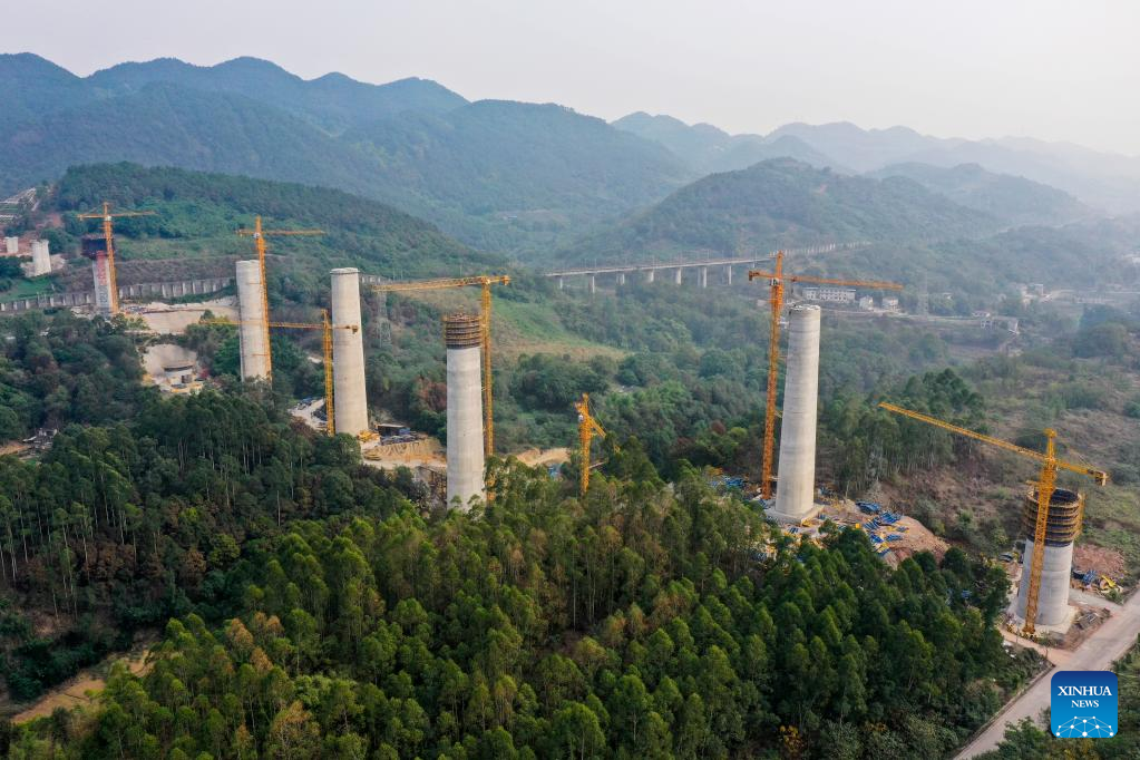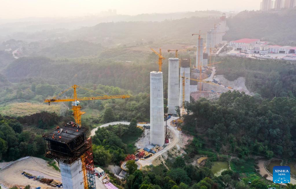 This aerial photo taken on Nov. 28, 2022 shows the Huafu mega bridge under construction at the Sichuan-Chongqing section of the Chongqing-Kunming high-speed railway in southwest China's Chongqing Municipality. The 699-kilometer-long Chongqing-Kunming high-speed railway with a designed speed of 350 kilometers per hour is a key constituent of the railway corridor linking China's capital Beijing and Kunming in southwest China's Yunnan Province. (Xinhua/Wang Quanchao)