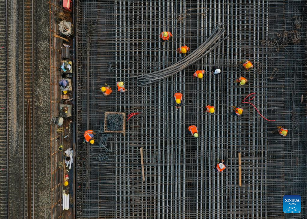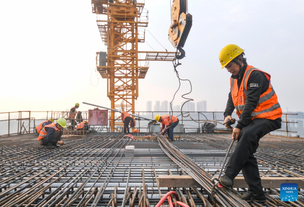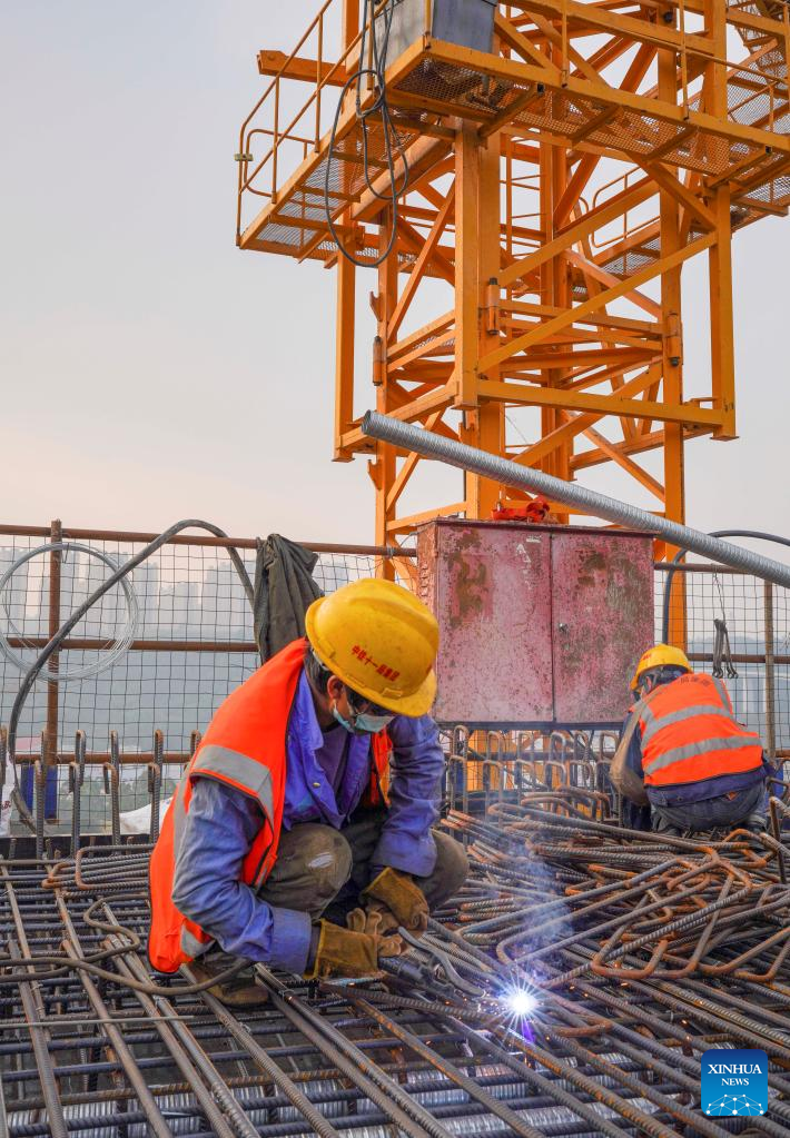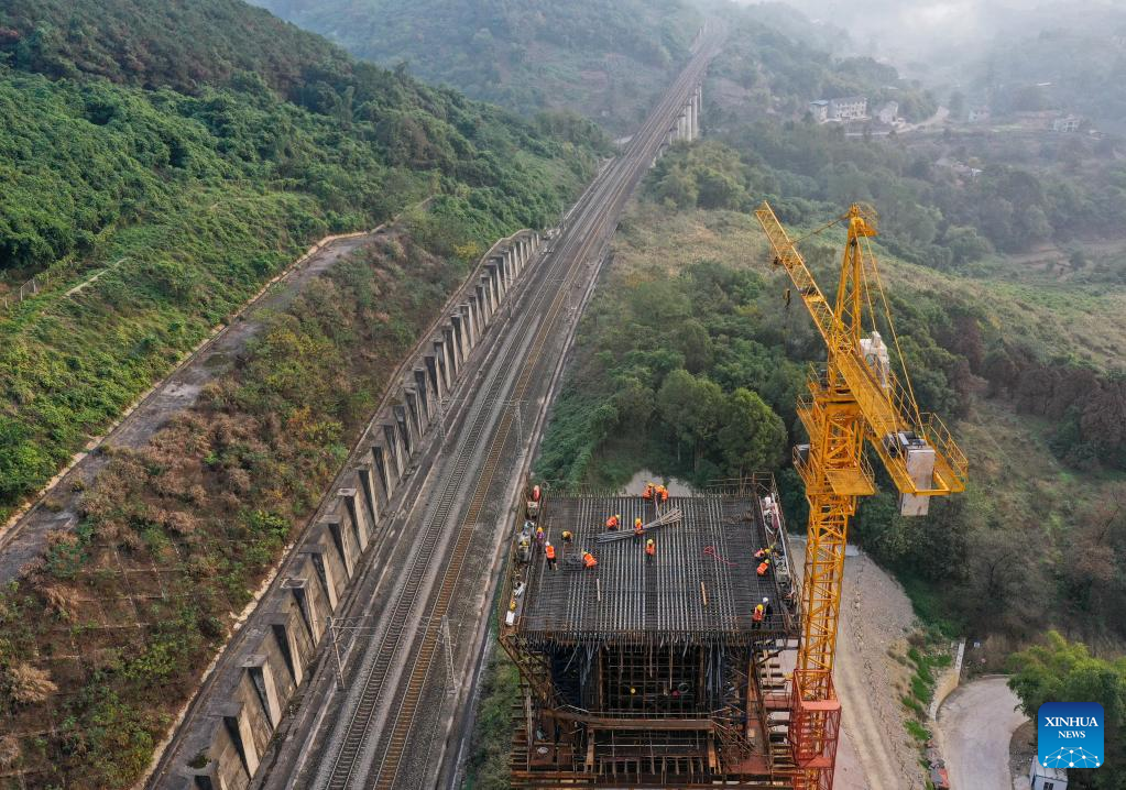 Workers are on duty at the construction site of the Huafu mega bridge at the Sichuan-Chongqing section of the Chongqing-Kunming high-speed railway in southwest China's Chongqing Municipality, Nov. 28, 2022. The 699-kilometer-long Chongqing-Kunming high-speed railway with a designed speed of 350 kilometers per hour is a key constituent of the railway corridor linking China's capital Beijing and Kunming in southwest China's Yunnan Province. (Xinhua/Wang Quanchao)