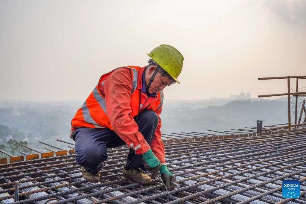 A worker is on duty at the construction site of the Huafu mega bridge at the Sichuan-Chongqing section of the Chongqing-Kunming high-speed railway in southwest China's Chongqing Municipality, Nov. 28, 2022. The 699-kilometer-long Chongqing-Kunming high-speed railway with a designed speed of 350 kilometers per hour is a key constituent of the railway corridor linking China's capital Beijing and Kunming in southwest China's Yunnan Province. (Xinhua/Zhu Gaoxiang)