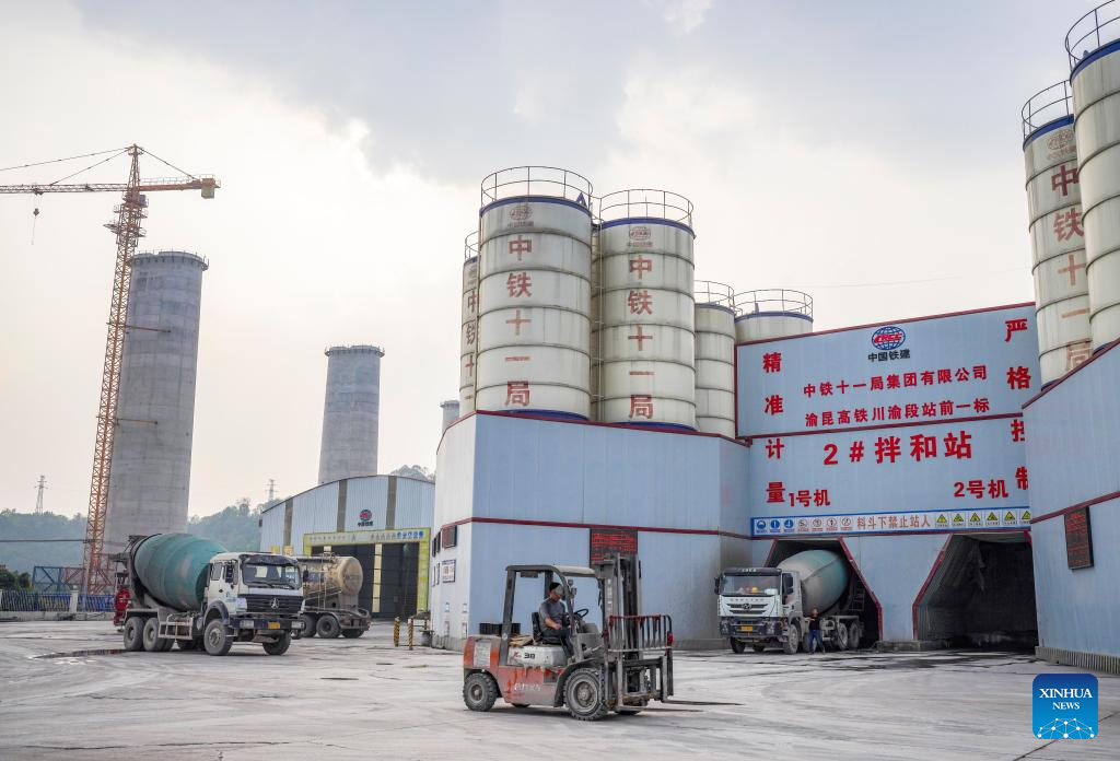 This photo taken on Nov. 28, 2022 shows a concrete batching plant for the construction of the Sichuan-Chongqing section of the Chongqing-Kunming high-speed railway in southwest China's Chongqing Municipality. The 699-kilometer-long Chongqing-Kunming high-speed railway with a designed speed of 350 kilometers per hour is a key constituent of the railway corridor linking China's capital Beijing and Kunming in southwest China's Yunnan Province. (Xinhua/Zhu Gaoxiang)