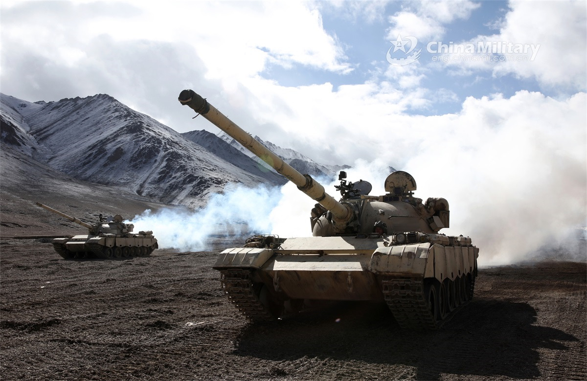 Main battle tanks attached to an armored element of a combined-arms regiment under the PLA Xinjiang Military Command rumble in the mountainous region during a driving drill on November 18, 2022. (eng.chinamil.com.cn/Photo by Yuan Kai)