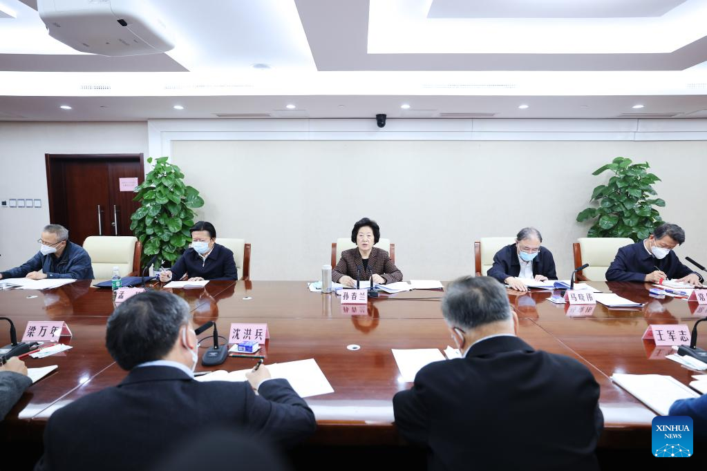 Chinese Vice Premier Sun Chunlan listens to experts' opinions and suggestions on improving epidemic containment measures at the National Health Commission, Nov. 30, 2022. (Xinhua/Liu Bin)