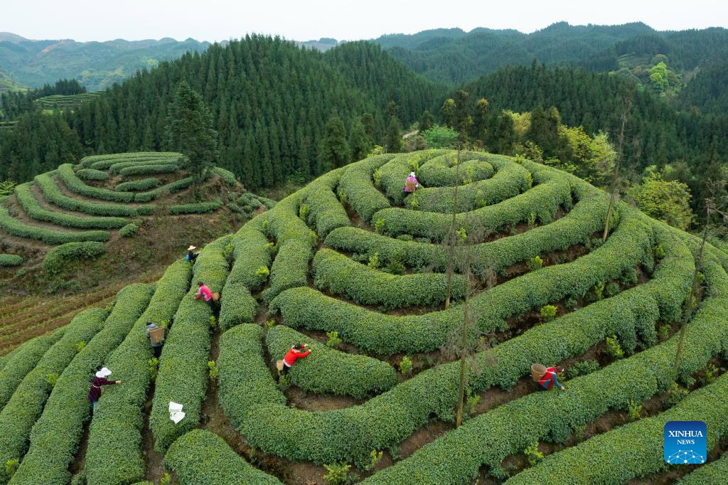 This aerial photo taken on March 30, 2022 shows tea farmers in cooperation with Zhang Yuehua picking fresh tea leaves at a tea garden in Mingshan District of Ya'an City, southwest China's Sichuan Province. Zhang, born in 1959, is a representative inheritor of green tea making technique. Boasting a long history of tea cultivation, Ya'an is the birthplace of dark tea and green tea making techniques. Inherited by generations of tea makers, both techniques are now listed as national-level intangible cultural heritage. (Xinhua/Shen Bohan)