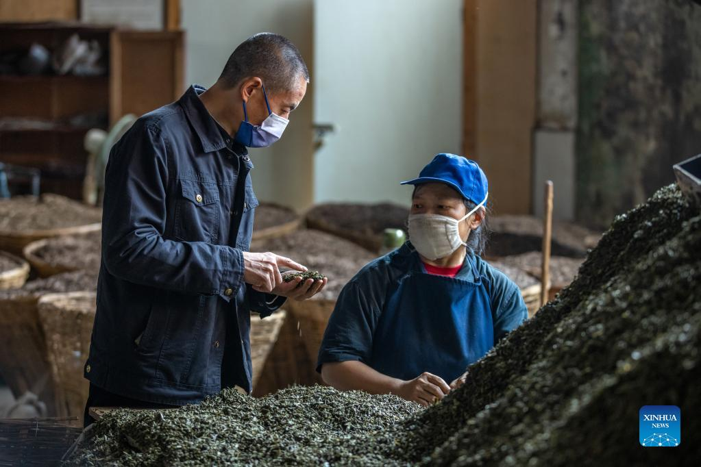 Gan Yuxiang (L) instructs a staff member to check the quality of tea leaves at a production workshop of Ya'an Youyi Tea Co., Ltd. in Ya'an, southwest China's Sichuan Province, Nov. 24, 2022. Gan, born in 1963, is a representative inheritor of dark tea making technique. Boasting a long history of tea cultivation, Ya'an is the birthplace of dark tea and green tea making techniques. Inherited by generations of tea makers, both techniques are now listed as national-level intangible cultural heritage. (Xinhua/Shen Bohan)