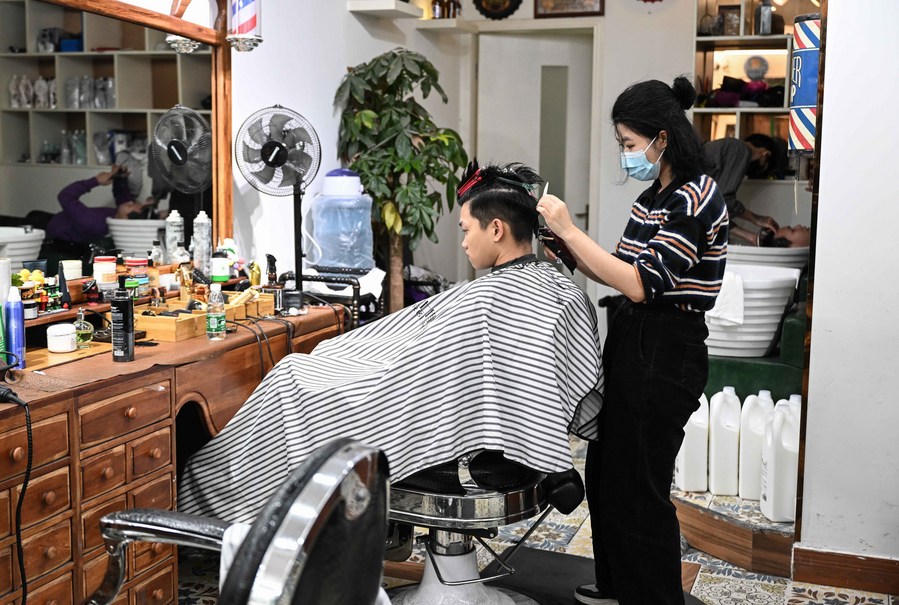 A hairdresser cuts a customer's hair at a hair salon in Liwan District of Guangzhou, capital of south China's Guangdong Province, Dec. 1, 2022. (Xinhua/Deng Hua)