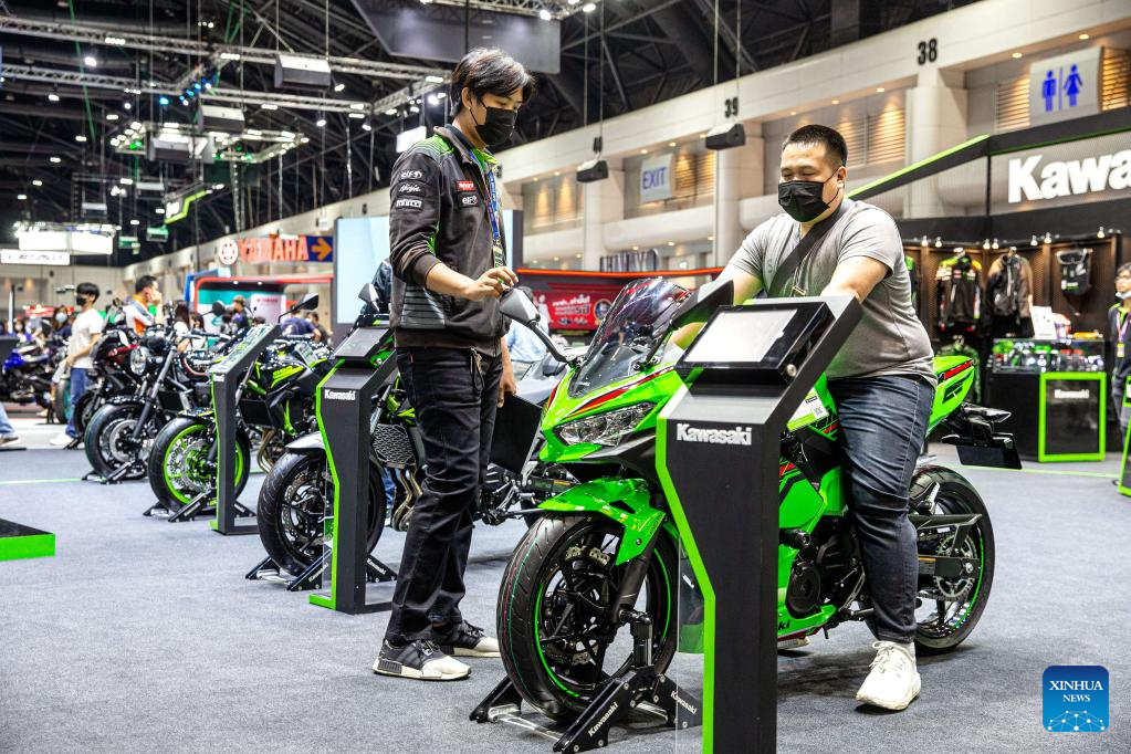 A man tries a motorcycle during the Thailand International Motor Expo 2022 in Bangkok, Thailand, Dec. 1, 2022. (Xinhua/Wang Teng)