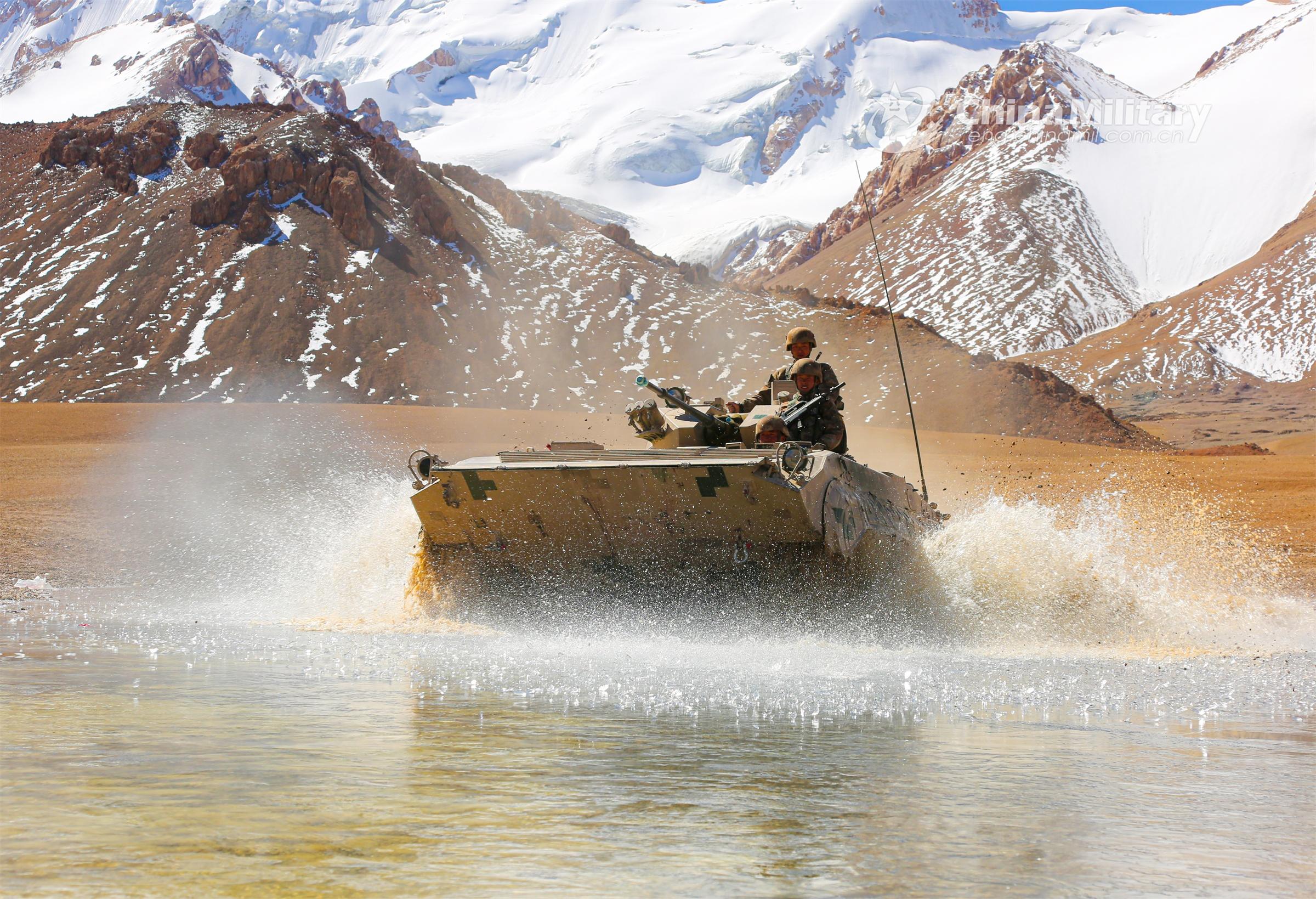 An armored vehicle attached to an armored element of the PLA Army wades through a water obstacle during the driving training course in complex terrain on November 14, 2022. (eng.chinamil.com.cn/Photo by He Rui)