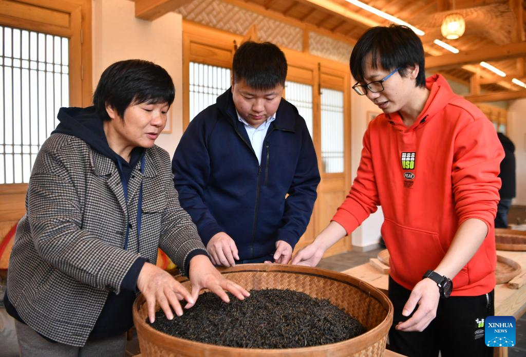 You Yuqiong (L), the only female inheritor of Wuyi rock tea making technique, instructs her son Fang Zhou (C) in the roasting technique of Wuyi rock tea in Wuyishan, southeast China's Fujian Province, Dec. 1, 2022. (Xinhua/Wei Peiquan)