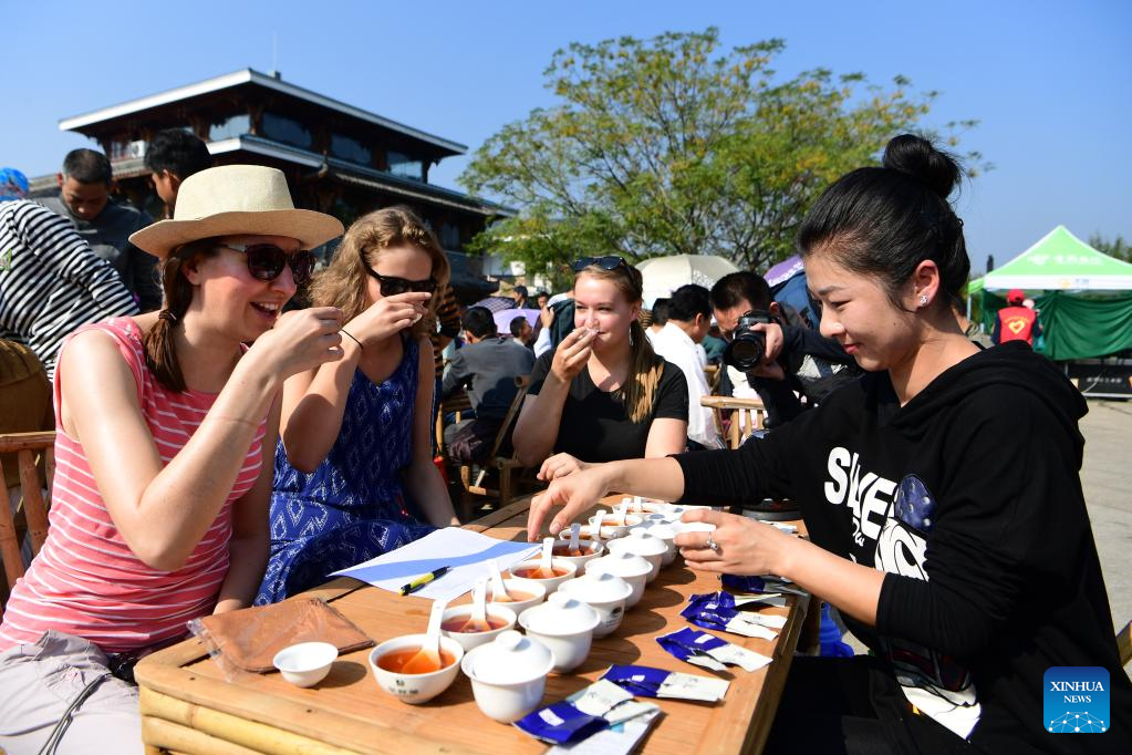 Foreign visitors taste Wuyi rock tea at a tea tasting competition in Wuyishan, southeast China's Fujian Province, Oct. 28, 2017. (Xinhua/Wei Peiquan)
