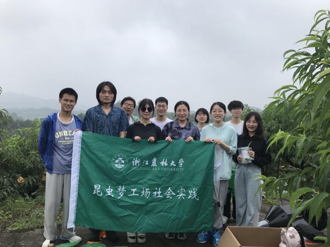 Students majoring in plant protection from Zhejiang Agriculture and Forestry University join a field trip with their teachers to a farm in Lin'an, east China's Zhejiang province, to offer technical guidance and products of pest control for local fruit farmers, June 30, 2021. (Photo from Zhejiang Agriculture and Forestry University)