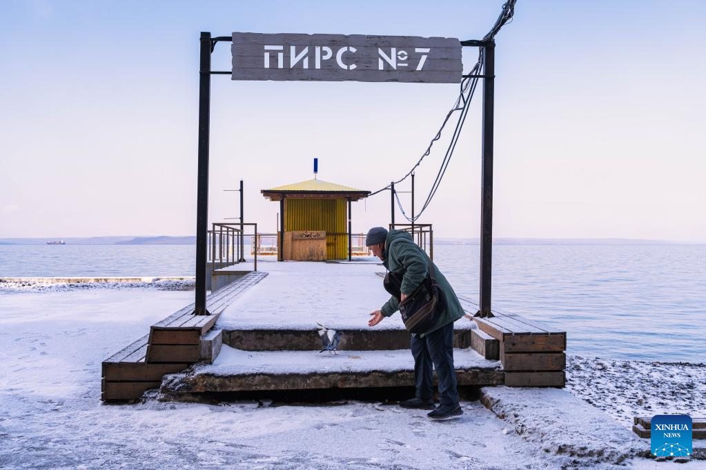 A man feeds a pigeon in Vladivostok, Russia, Dec. 3, 2022. (Photo by Guo Feizhou/Xinhua)