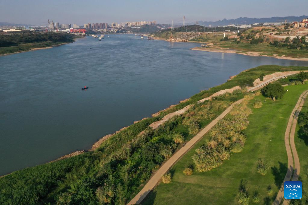 This aerial photo taken on Nov. 2, 2022 shows flood-tolerant plants on Guangyang Isle in southwest China's Chongqing. (Xinhua/Wang Quanchao)