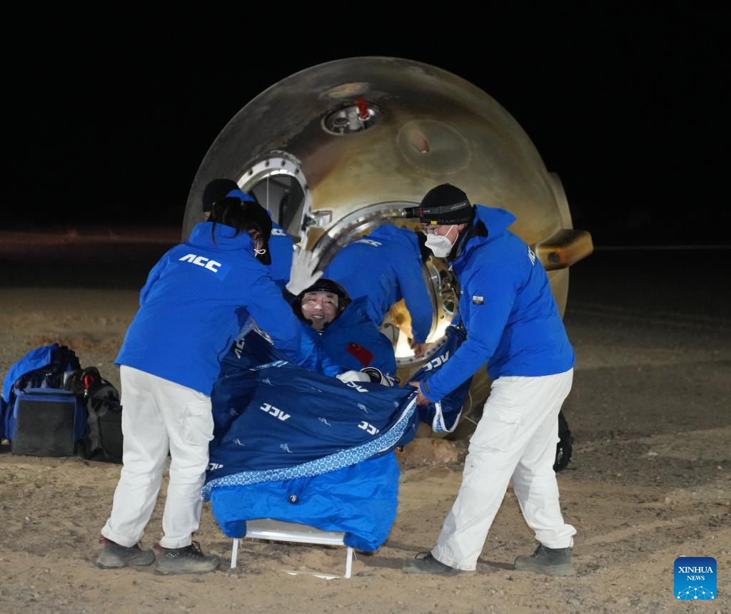 BEIJING, Dec. 4 (Xinhua) -- Three Chinese astronauts on board the Shenzhou-14 manned spaceship returned to Earth safely on Sunday, after accomplishing many "firsts" during their six-month space station mission.