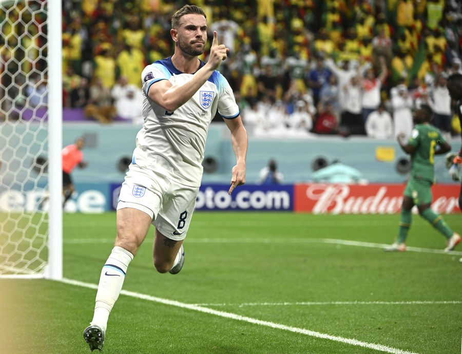 Jordan Henderson of England celebrates his goal during the Round of 16 match between England and Senegal of the 2022 FIFA World Cup at Al Bayt Stadium in Al Khor, Qatar, Dec. 4, 2022. (Xinhua/Li Ga)