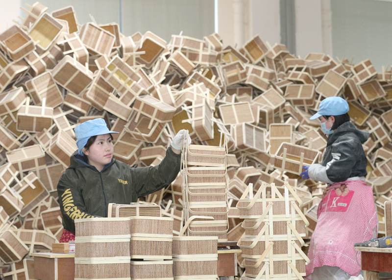 Employees produce bamboo utensils at a company in Meixi township, Anji county, Huzhou city, east China’s Zhejiang Province, Feb. 10, 2022. (vip.peole.com.cn/Xia Pengfei)