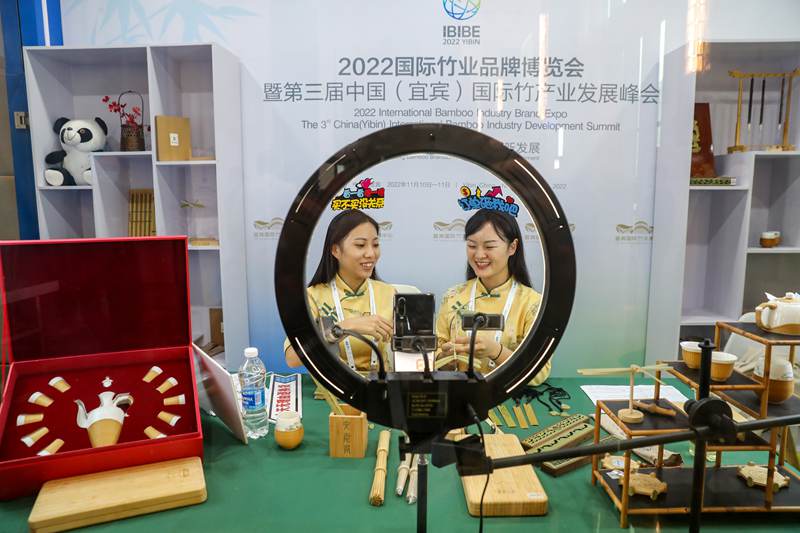 Employees of the Yibin International Bamboo Products Trading Center advertise bamboo products during a livestreaming session at the Yibin International Convention Center in Yibin city, southwest China’s Sichuan Province, Nov. 10, 2022. (vip.peole.com.cn/Zhuang Ge’er)