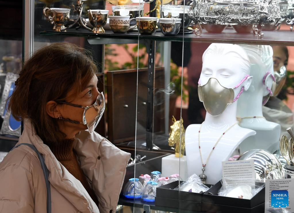 A woman looks at an antibacterial mask made of pure silver and gold, in Istanbul, Türkiye, Dec. 1, 2022. The antibacterial mask is a previous design of Sabri Demirci, an artisan and owner of a silver shop in Istanbul.(Xinhua/Shadati)
