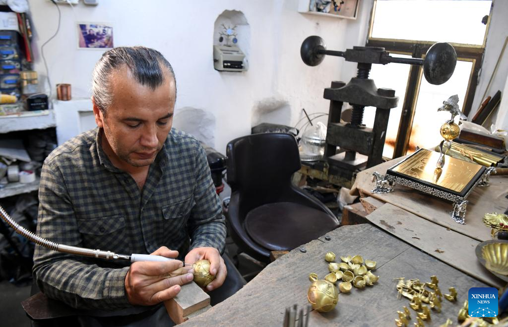 Sabri Demirci, an artisan and owner of a silver shop, works at his atelier in Istanbul, Türkiye, Dec. 1, 2022.(Xinhua/Shadati)
