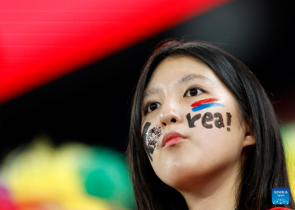 A fan of South Korea waits for the start of the Round of 16 match between Brazil and South Korea at the 2022 FIFA World Cup at Ras Abu Aboud (974) Stadium in Doha, Qatar, Dec. 5, 2022. (Xinhua/Wang Lili)