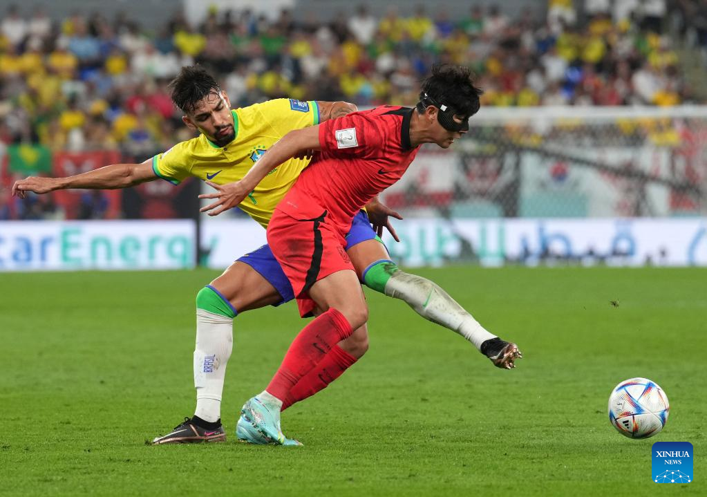 Lucas Paqueta (L) of Brazil vies with Son Heung-min of South Korea during their Round of 16 match at the 2022 FIFA World Cup at Stadium 974 in Doha, Qatar, Dec. 5, 2022. (Xinhua/Chen Cheng)