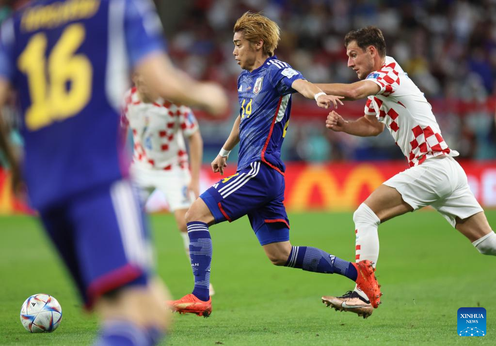 Ito Junya of Japan (C) vies for the ball during the Round of 16 match between Japan and Croatia at the 2022 FIFA World Cup at Al Janoub Stadium in Al Wakrah, Qatar, Dec. 5, 2022. (Xinhua/Li Ming)