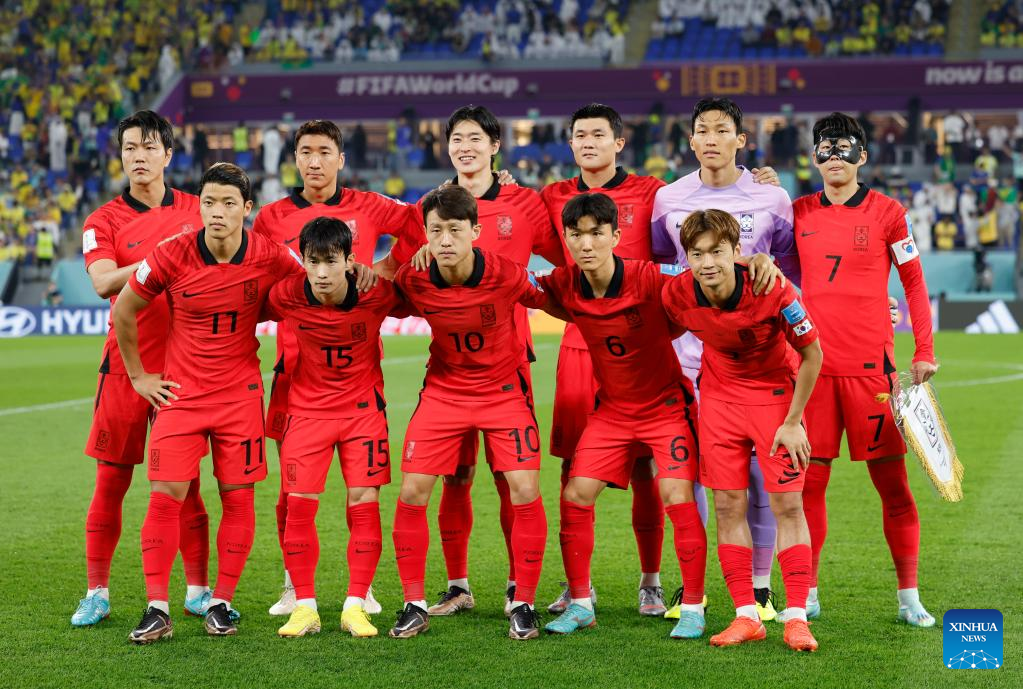 Start players of South Korea pose for group photos before the Round of 16 match between Brazil and South Korea at the 2022 FIFA World Cup at Ras Abu Aboud (974) Stadium in Doha, Qatar, Dec. 5, 2022. (Xinhua/Wang Lili)