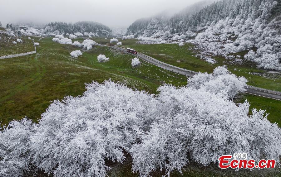 Trees are decorated with rime on Fairy Mountain in southwest China's Chongqing, turning the mountain range a winter wonderland. (Photo: China News Service/Wang Junjie)