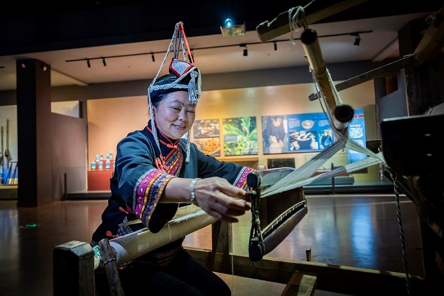 An inheritor of a provincial-level cultural heritage operates a loom at a museum of She ethnic culture in Jingning She autonomous county, Lishui city, east China's Zhejiang province, May 2022. (People's Daily Online/Li Suren)