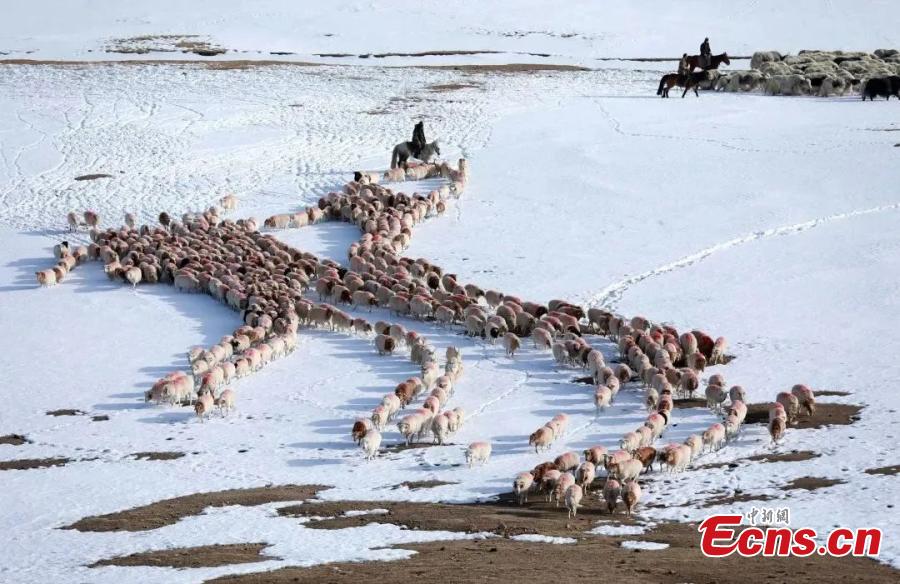 Herders drive livestock heading for a winter pasture in northwest China's Xinjiang Uyghur Autonomous Region. (Photo: China News Service/Yuan Junping)