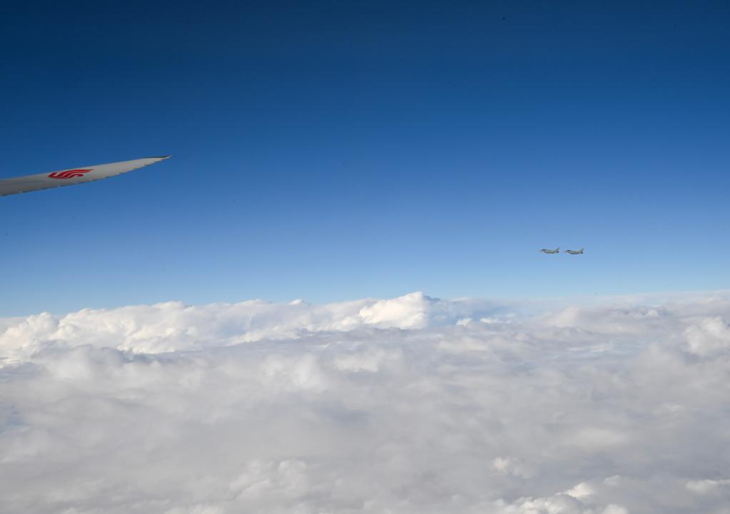 This photo taken on Dec. 7, 2022 shows fighter jets from the Royal Saudi Air Force escorting Chinese President Xi Jinping's plane after it enters Saudi airspace. (Xinhua/Xie Huanchi)